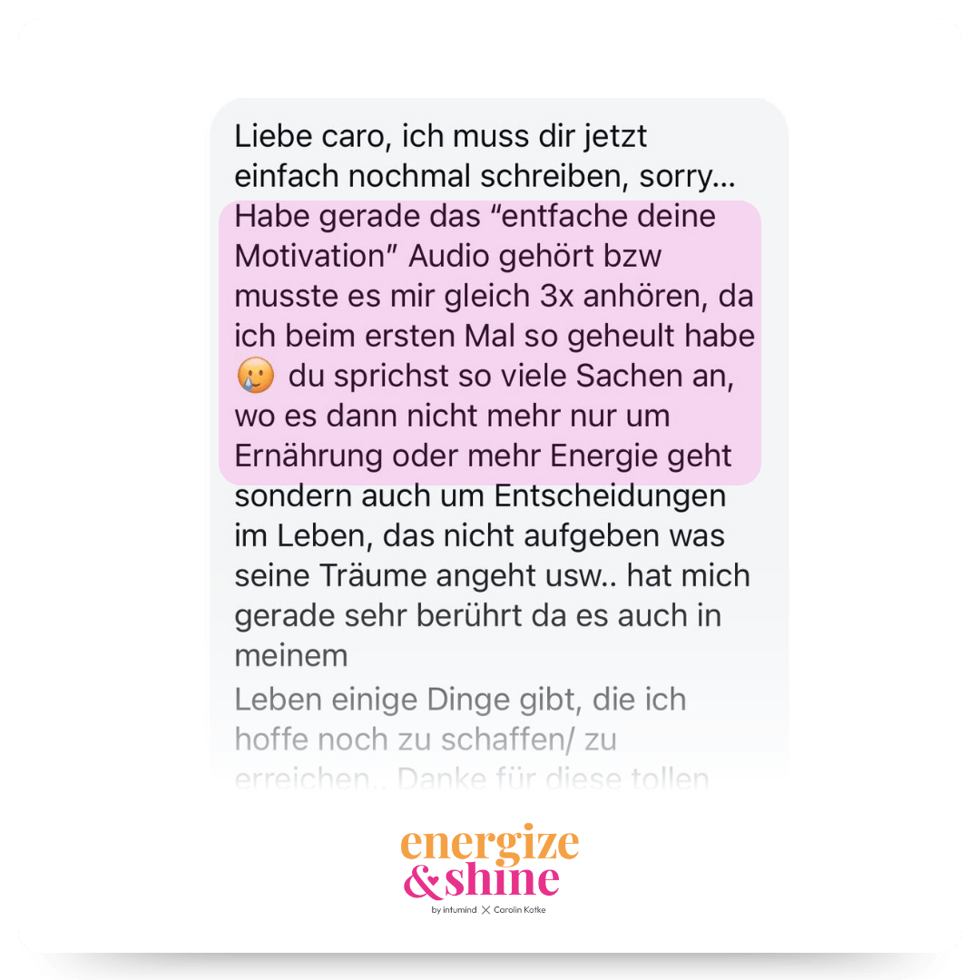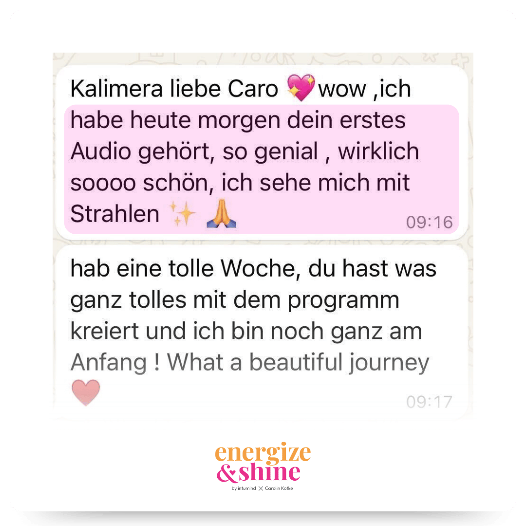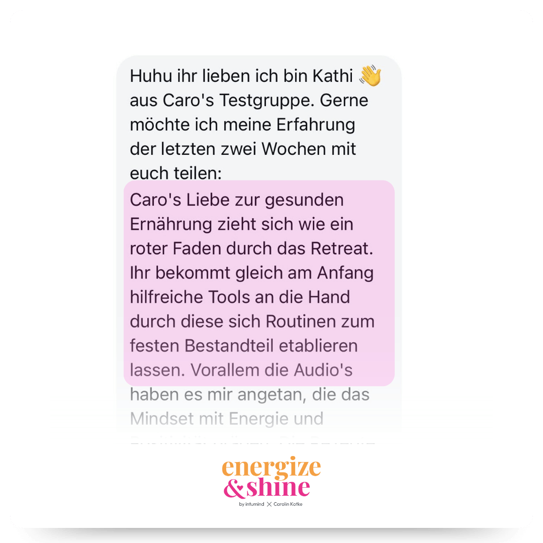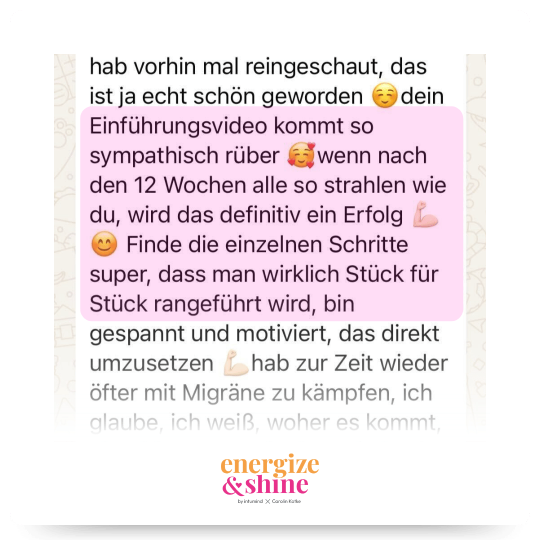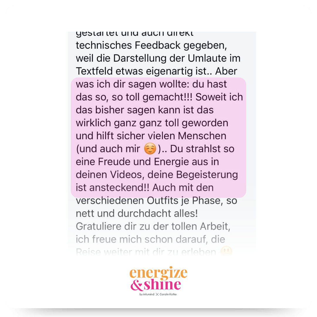 Wir sind überzeugt, dass du mit „Energize & Shine – Dein Weg zu mehr Energie und Wohlbefinden“ viele Erfolgserlebnisse haben wirst. Durch unsere intumind 30-Tage-Geld-zurück-Garantie kannst du dich selbst rundum überzeugen! Du hast also nichts zu verlieren und wir laden dich ein, das Programm einfach für dich auszutesten. Wenn wir dich noch näher unterstützen können, schreibe uns gerne eine Mail an [email protected]