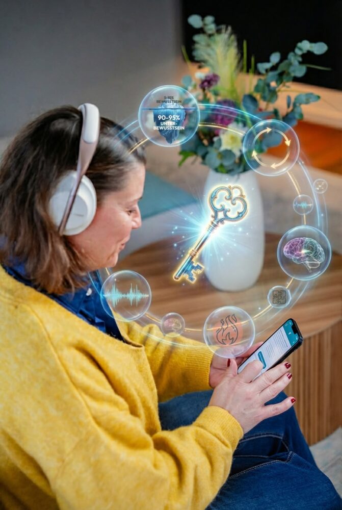 Die Audios sind spezielle Trainings, die du täglich hörst (10-20 Minuten). Sie nutzen Techniken aus der Neuropsychologie, um dein Unterbewusstsein zu erreichen – dort, wo deine automatischen Gewohnheiten gespeichert sind.